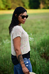 Wild Flowers is a drop-shoulder construction tee, worked from the top-down. To begin, the upper portion of the front and back are worked flat, separately, with shoulders shaped by short rows. At the bottom of the armhole, the front and back yokes are joined, and the body is worked in the round. The sleeve cuffs and collar are worked after completion of the main body.