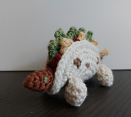 This is Paco, a corn tacosaur, and his cousin, Flora, who is a flour tacosaur. They are mini tacos and measure about 3 in. tall x 5.75 in. long (about 7.5 cm x 14cm). Many of their elements can be made with scrap yarn, as long as it is all the same weight size.