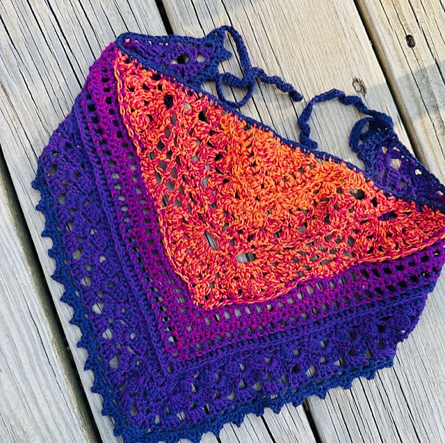 This pattern is customizable. Use any yarn weight as long as you match your hook. Altering your hook and / or yarn weight will give you a bigger or smaller size respectively. For the finished bandana pictured, I used a fine / fingering weight yarn with a 3.25mm hook. This creates a roughly 24cm height from the tip of the triangle to the middle of the straight edge, and roughly 37cm from corner to corner of the straight edge (not including the ties).