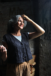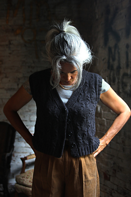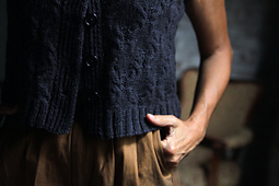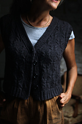 This deep dark gray has a timeless quality to it, so I went with a classic buttoned vest in an allover cable pattern, for a knit that would be right at home in a library, curled up in a leather chair with your favorite book.