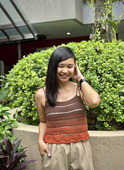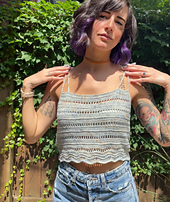 This top is constructed top down, first separately creating the front and back panels in turned rows, then joining them and working in turned rounds. The straps are then made.