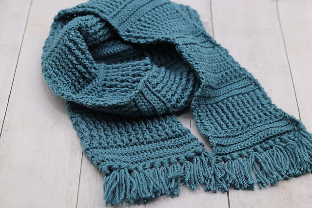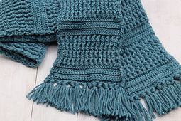 The Windermere Scarf crochet pattern was designed to complement the Windermere Beanie Crochet Pattern. The scarf features a variety of textured crochet stitches and may be worn with a fringe or without.