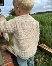 The white Storm Sweater Junior is knitted in Peer Gynt by Sandnes Garn in the color Almond \[2511\].