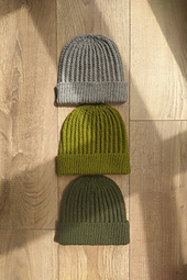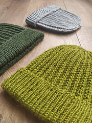A simple beanie pattern featuring the Mistake Rib stitch, with a folded 1x1 rib brim.