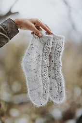 Knitted from the toe up, using a short-row heel, carrying one strand of DK weight yarn together with 2 strands of mohair for extra warmth and comfort.
