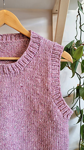 This vest is worked seamlessly from the top down. It starts by casting on stitches for the upper back, and working flat down to the underarm. You will then put those stitches on hold, and pick up separate stitches for the front shoulders to then shape the neckline. Next you will continue the front down to match the back, and then join in the round to work the body. Once the body is finished, stitches will be picked up for the neckline and armholes to work the ribbed edges in the round.