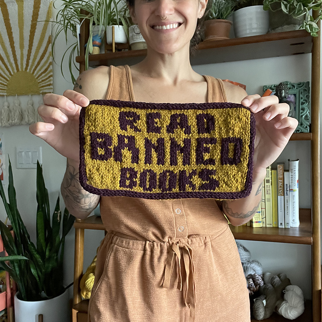 - While you knit a READ BANNED BOOKS Banner, meditate on how you can use your unique voice, interests, and talents to create change in your community.