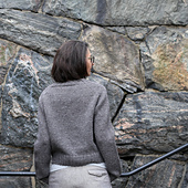 Granit cardigan is worked in stockinette stitch with ribbed trims. The cardigan is worked top down in one piece, with curved V-neck and raglan lines. The body is worked flat. After the yoke shaping is finished, the sleeve stitches are placed on hold and the body is worked straight to the hem. The button band, with one-row buttonholes, is worked after completion of the body. The sleeves are then worked in the round.