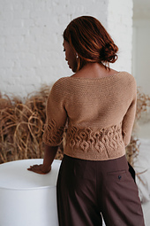 It was my intention that Rasa tell the story of a calm, early morning reflection. This gorgeous sweater focuses on a simple base, displaying a texture reminiscent of dew drops on a blade of grass. By incorporating a continuous ribbing element in the solid background, the diamond-shaped post stitches bring out a subtle yet strong pattern.