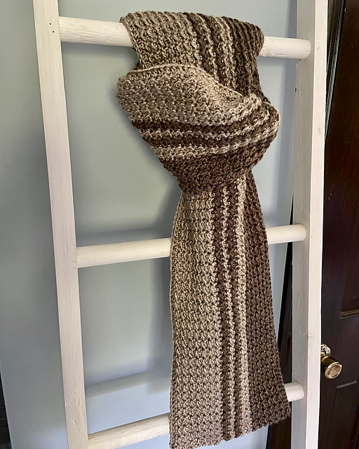 The even moss stitch is a one row repeat of alternating slip stitches and half double crochet. The crochet men’s scarf has beautiful drape in spite of the rather dense nature of the even moss stitch.