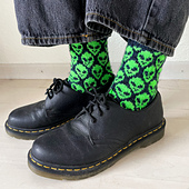 Who can resist friendly aliens all over their socks. Inspired by the latest headlining news coming from the USA that we are apparently not alone in the universe, I was eager to create some fun, happy alien socks to welcome our intergalatic visitors! These socks are perfect for anyone who loves some sci-fi-UFO mystery and great for any halloween trick or treating activites this season. I think you will probably find me wearing these while chilling in the comfort of my own home, watching some old X-Files episodes. Here´s to hoping our alien visitors are going to be as friendly as the ones found on these socks!