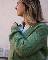 The cardigan is worked flat in Stockinette stitch on 5 mm / US 8 needles. First the back is worked back and forth while shaping the shoulders. Stitches are picked up for the upper front separately, then all stitches are worked flat through the body. Stitches are picked up for the sleeves and worked in the round and lastly stitches are picked up along the front edges for a double knitted placket.