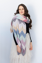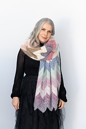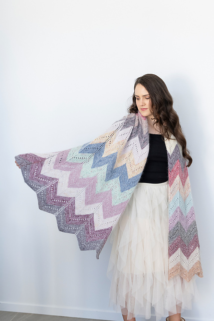 The Trifle Wrap takes after its namesake in every way: light and decadent, gorgeously layered, and delightfully over the top. Designed to use 24 twenty gram fingering- weight mini skeins held double with a strand of silk mohair lace yarn, this is a perfect project for your festive yarn set. But as with a real trifle, it can also be made beautifully out of leftovers from your stash: that’s what I used for the sample. Like the cream that mingles trifle’s many ingredients into one transcendent pudding, the fluffy mohair softens and melds even the most random assortment of scraps into one delicious masterpiece.