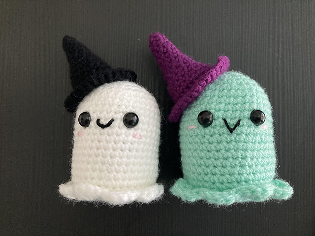Pattern for a small amigurumi ghost with a witches black hat. Gauge isn’t really important. Feel free to use what hook size and yarn you normally prefer for amigurumi.