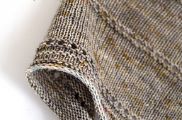This pattern could easily be made with fingering to worsted weight yarn. By simply adding more repeats of the stockinette and garter ribbed eyelet sections, you can make a kerchief or shawl as large as you wish. Note that yardage requirements will vary with different yarn weights.