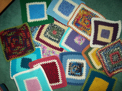 Note from the designer: An advantage of this pattern for using bits of yarn is that, since there is no end to rows or rounds, you can just tie on a new yarn when your previous yarn ends. You can also alternate yarns "round by round" to make it look stripey. Fun yarns can be included for a row or two to give the square interesting texture.