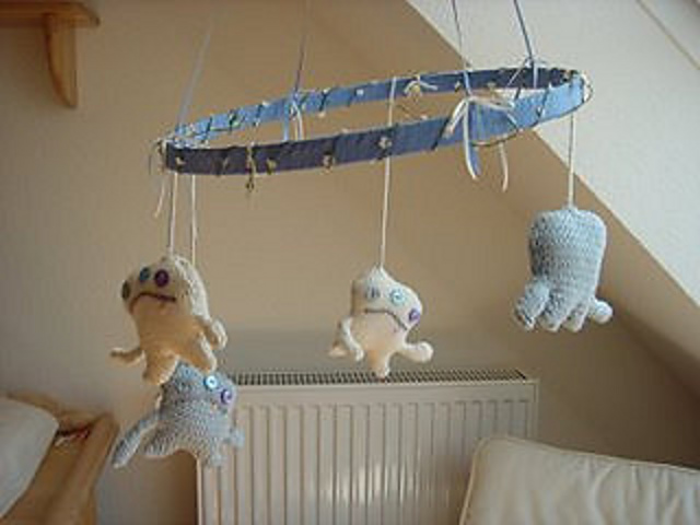 **Mobile with 4 knitted monsters.**