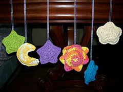 **From the description:** Thank heaven for babies! Dangling high above the crib, this celestial mobile, worked in Bernat Cottontots, will provide hours of entertainment. For each piece you fashion two side, then join with single crochet. Mount as you wish on an embroidery hoop or from dowels.