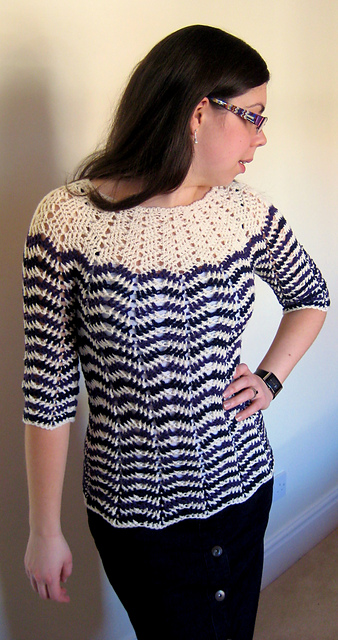 The pattern is worked in the round from the top down so it is easy to try it on as you go and acheive a correct fit. Pattern includes decrease rows so that you can fit the sweater to your waist (pattern is designed to be a close fit with negative ease).