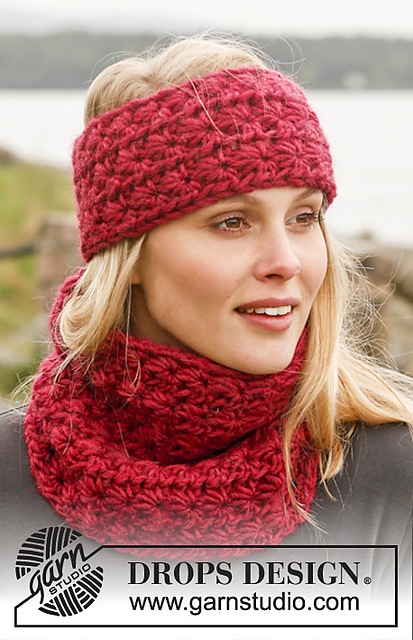**Crochet DROPS head band and neck warmer in "Snow".**