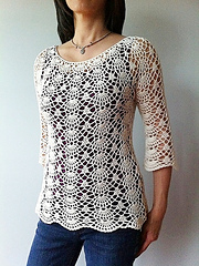 This semi-fitted top is worked from the neck down with gentle shaping below the waist for a figure skimming, flattering fit. Brimming with delicate lacy shells, this feminine piece is equally beautiful as a cropped top or tunic, with the sleeves three-quarter, slightly flared or short – the choice is yours.