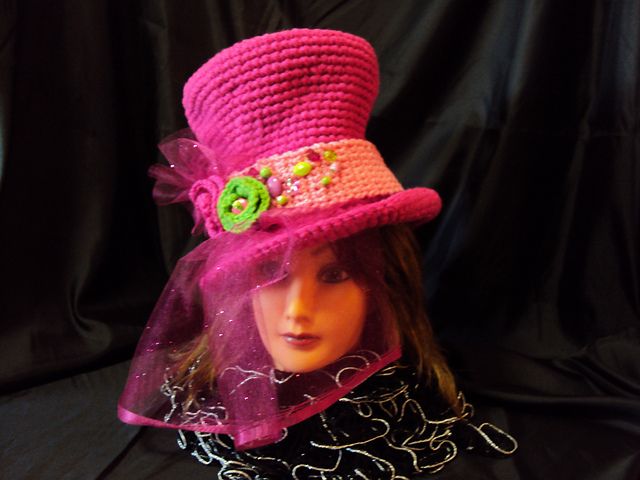 Look like you just stepped out of a cinematic film in this fetching crocheted top hat! Deck it out with crocheted flowers, sequins and netting as we did, or let your creativity go as wild as you please.