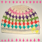 You can use any colour combination you like to make this hat yours. The photos show a multicolour hat and one in brown and cream. I've used Schachenmayr Catania, a sports weight cotton yarn and hook 3.5 (E) to obtain a hat that fits a 3-6 months old child (35-40 cm around).