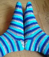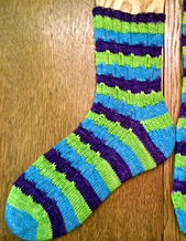 This pattern is for a basic sock, in a large range of sizes, and both toe-up and cuff-down. The pattern includes the OMG heel: **O**ne-needle **M**ock **G**usset for toe-up or **O**ne-needle **M**ini **G**usset for cuff-down. This heel does not disrupt the striping on the top of the foot because the gusset increases/decreases and turning of the heel is all on the bottom of the foot.