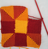 The Ten Stitch Blanket is worked in a spiral (or “rounds of rows”) around a central square of 10 stitches by 10 rows. The beauty of the project is that the short rows (10 stitches per row, less on the corner rows) propel you forward like you wouldn’t believe and it is the perfect pattern for using up any and every scrap of yarn in your house.