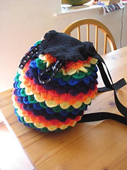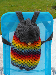 I really like crocodile stitch, though I think it is too thick for most garments. However, this becomes an advantage when making a bag or backpack. In my stash, I happened to have self-striping Kauni yarn featuring long color transitions, and it worked really well for this project. Matching self-striping yarn to a project is often a matter of guesswork, so I feel I got lucky with this one. The bottom, flap and straps were knitted using a solid black yarn to complement the colorful body of the bag.