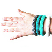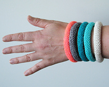 YARN: 15 yards/ DK/8ply yarn for a single bangle. Samples used: Madelinetosh, DK Twist (100% merino, 250yds/229m) In the following colorways: Antler, Button Jar Blue, Nassau Blue, Charcoal and Neon Peach.