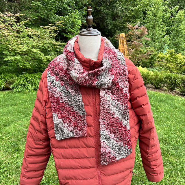 This scarf is inspired by Red Heart’s Free Pattern for a Corner to Corner Afghan. See bottom of this article for the links and video instructions for that afghan. I am not taking responsibility for designing this pattern. By using Red Heart’s pattern and the corner to corner concept, you can make unlimited triangles and 4 sided projects. Corner to corner doesn’t mean the project needs to be square.
