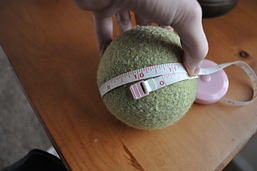 You will need to make a ball of yarn 9 1/4 inches in circumference to go inside the crocheted pouch. The size of the ball after felting will be between 10 and 10 1/2 inches in circumference.