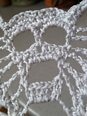 No gauge needed! You can use thread or something thicker, though I believe snowflakes do better with a nice sturdy cotton thread in order to starch up well. This snowflake is large, about 9 to 10 inches in diameter. It would make a great candle doily as well.