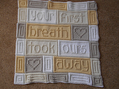 This crocheted blanket is an original baby blanket design that is easy to complete. The blanket when finished says, “your first breath took ours away.”