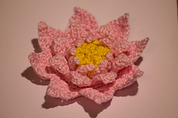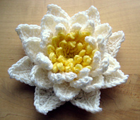 This lovely water lily is worked in the round from the centre out. The stamen and petals are worked into the front loops of the round before the next increase of the base circle is worked into the unworked back loops.