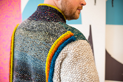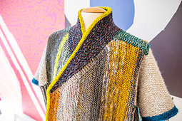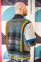 *Gather a colorful array of yarns from your collection and knit a dreamy convertible jacket! Begin with a seed stitch rectangle followed by a series of welts on the back. The sides and fronts are knit sideways in garter stitch with simple v-neck shaping. Then, work two rectangles for the shoulders and tapered seed stitch sleeves. Garter stitch short rows form the collar and another garter stitch rectangle forms the bottom band, all outlined in I-cord. Penguono is a fun short sleeved jacket during the day, but flip it upside down and it becomes a long dramatic coat for evening wear.*