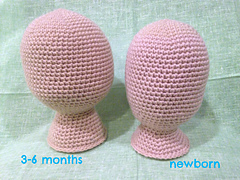 This pattern is for a mannequin head that you can use to display and photograph hats. There are two sizes, newborn and 3-6 months. They are crocheted in the round with a G hook and a red heart super saver yarn and stuffed firmly. My finished sizes are 13 inches around for the newborn size and 16 inches around for the 3-6 month size.