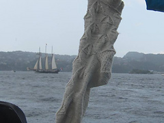 A fun, feminine ruffle leads to pretty sails flying around the leg of Mrs. Anne Wentworth's sock. The lacy sails are formed with slip-stitches and garter stitch.