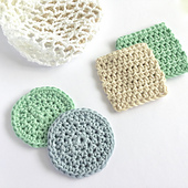 The face scrubbies / cleansing pads are made with light worsted weight (Category 3, double-knitting, DK) yarn. You will need a size 7 (4.5mm) crochet hook and a size 8-H (5mm) crochet hook for these items.