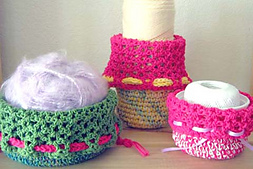 This pattern has three sizes of yarn bowl bags. Samples shown with plastic container inserts in two sizes: standard cottage cheese container (13"/33 cm. circ., 4.5"/11 cm. diam.) and larger plastic bowl or Cool Whip container (18"/46 cm. circ., 6"/15 cm. diam.)