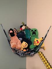 Tired of all your kids' stuffies on the floor? Put them up! This hammock fits right in the corner of a wall and holds a lot of stuffies and toys. I have one for each of my kids and it's great. You can put it lower so they can reach, or if you're like me, up high so they stay where they are until they want one down to play with. This pattern is crazy easy to make and works up nice and fast. You can use virtually any kind of yarn, so it's great for using up scraps. Enjoy!