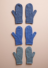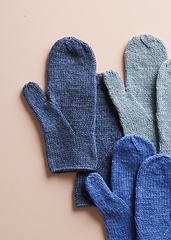 SAMPLES: The Soft Sky mittens are Kid size, the Flax Flower Blue mittens are Adult Small, and the Blue Whale mittens are Adult Medium. The original Flax Down samples are Kid size in Yellow Yellow and an Adult Medium in Heirloom White.