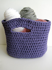 This basket has an oval shaped base and handles. It is worked up using two strands of yarn held together. It perfect for storing your yarn and WIPs.