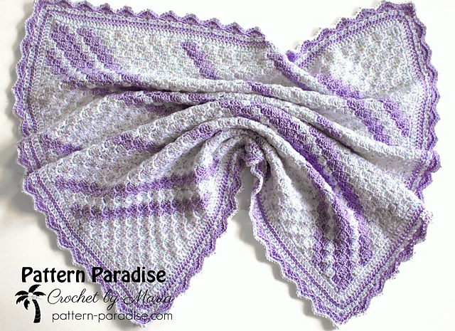 This blanket works up quickly and is so pretty with the contrasting color stripe work. Of course you can make it in as many colors as you like. The border is simple but elegant and finishes off the blanket perfectly.