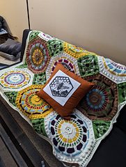 This design was inspired by the sun shining on colorful stepping stone mosaic tiles in my yard. I had long been thinking of turning a round mandala into an octagon in order to join in a blanket, and in this design I tried to imagine each colored piece as a differently shaped mosaic tile.