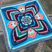 This twelve inch afghan block is inspired by Islamic architecture, Art Nouveau, and perhaps a little Gershwin. Four petals gently flare and then taper to lightly rounded points. Behind them, the illusion of a square on point. The final rounds are left simple to accentuate the flowing lines or for you to experiment and embellish as you wish.