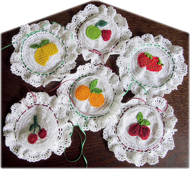 **Approximate finished size:** Jar cover will fit a 2½-inch/6 cm to 3-inch/7.5 cm wide lid, up to ½-inch/1.25 cm deep. Frill measures 1-inch/2.5 cm deep. Fruits are 1-inch/2.5 cm to 1½-inch/4 cm high