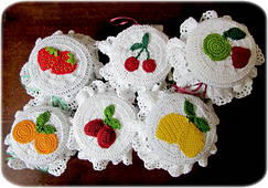 **Materials required:** 1.50 mm crochet hook, No 12 or No 10 crochet cotton (1 x 50g ball will make 6 jam jar covers), plus small amounts of other colours for fruits, 2-3 mm ribbon, (optional - small amount of washable padding or stuffing material to pad fruit)