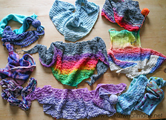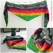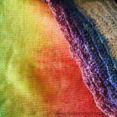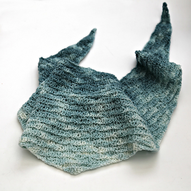 The Lazy Waves Shawlette is tiny! It is dense and mildly textured. Made in a slow colour-change sock yarn, it is perfect for using as a neckerchief. Depending on your personal tension, it can even be used as a small shawl.